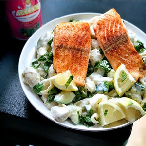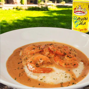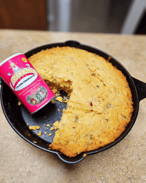 Shrimp tacos, seasoned with Zyde'ceaux Joe's Cajun Seasoning, topped with crema, pico de gallo, cotija cheese, and Boerne Brand Smokin’ Red hot sauce.